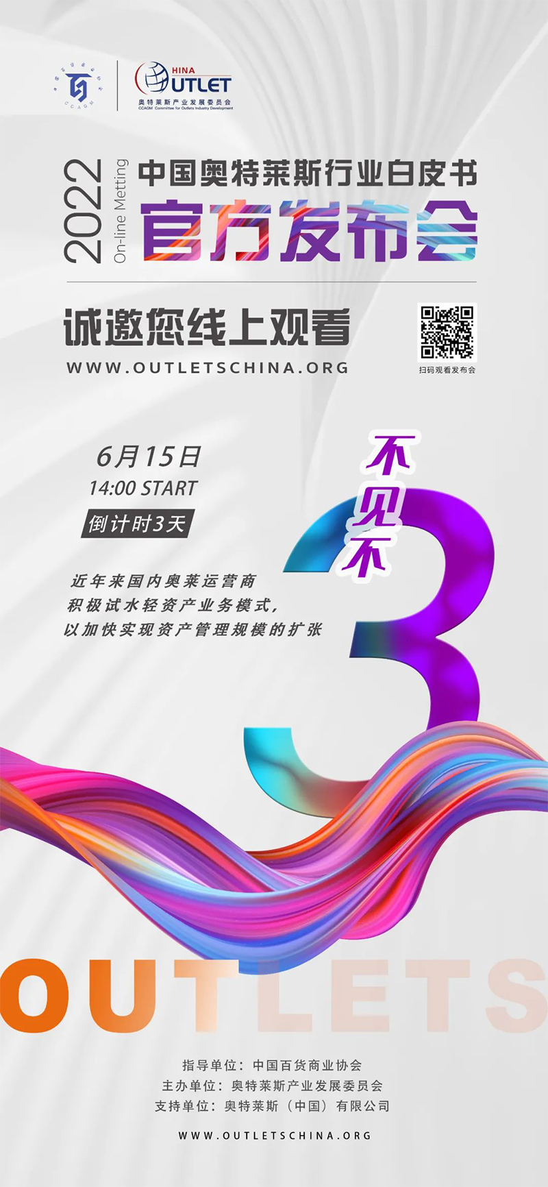 2022年6月15日14:00,《2022年中國(guó)奧特萊斯行業(yè)白皮書》線上發(fā)布會(huì)即將正式開始,本次發(fā)布會(huì),將對(duì)國(guó)內(nèi)零售市場(chǎng)及奧萊產(chǎn)業(yè)引入中國(guó)20年發(fā)展的經(jīng)驗(yàn)及機(jī)遇做出全新解讀。