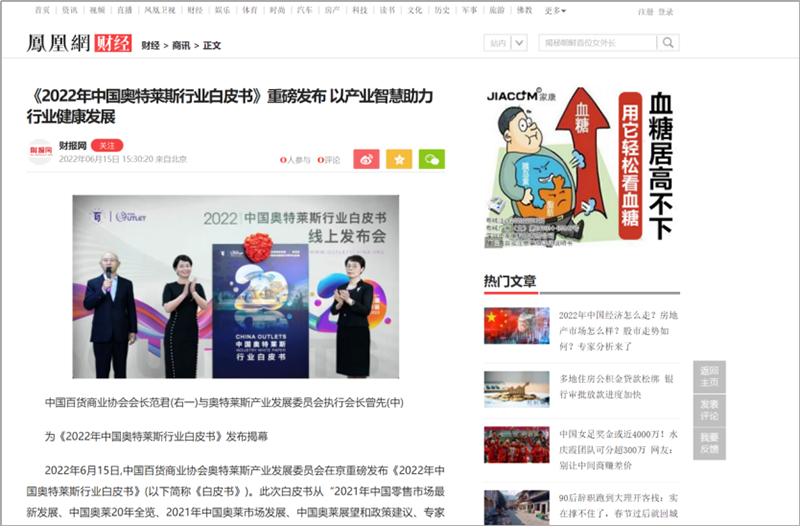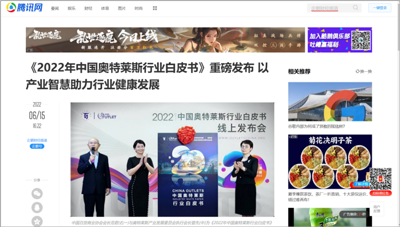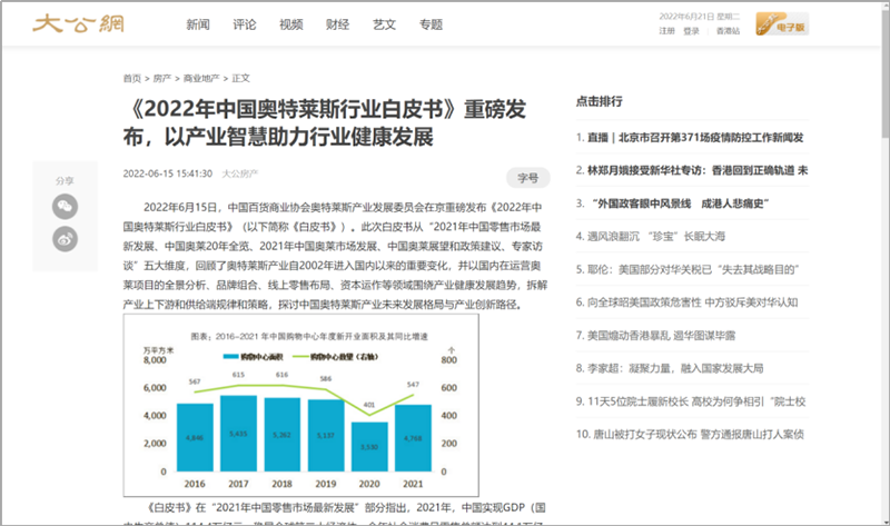 2022年6月15日,中國(guó)百貨商業(yè)協(xié)會(huì)奧特萊斯產(chǎn)業(yè)發(fā)展委員會(huì)線上直播發(fā)布《2022年中國(guó)奧特萊斯行業(yè)白皮書(shū)》。白皮書(shū)中“2021年中國(guó)零售市場(chǎng)最新發(fā)展、中國(guó)奧萊20年全覽、2021年中國(guó)奧萊市場(chǎng)發(fā)展、中國(guó)奧萊展望和政策建議、專家訪談”等內(nèi)容吸引政府領(lǐng)導(dǎo)、專業(yè)機(jī)構(gòu)、產(chǎn)業(yè)運(yùn)營(yíng)商、品牌商、服務(wù)商、媒體記者及眾多奧萊消費(fèi)者共計(jì)20余萬(wàn)人參會(huì),成為國(guó)內(nèi)奧萊行業(yè)年度一大焦點(diǎn)。
