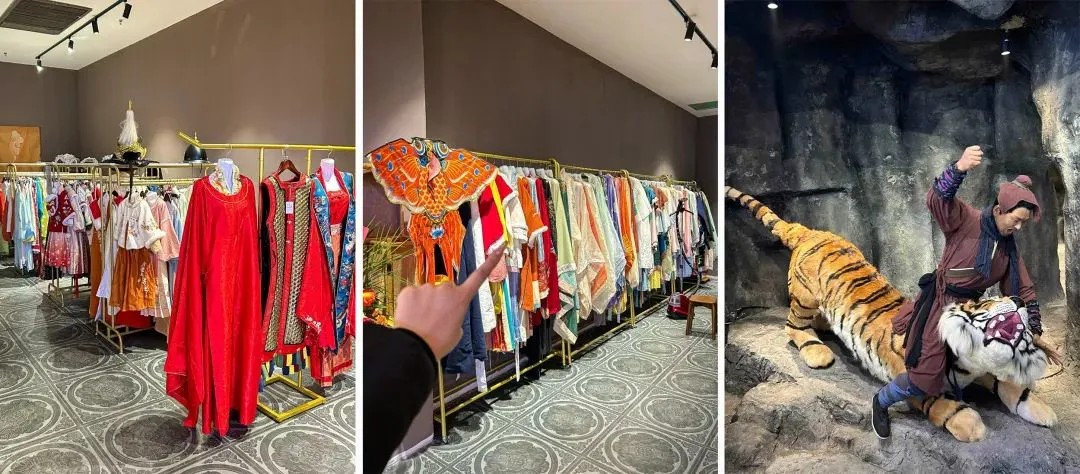 宋朝食間的另一大亮點(diǎn)是漢服體驗(yàn)館(需付費(fèi))。除了提供宋朝傳統(tǒng)的男子常服襕衫、女子襦裙款式,也有不少經(jīng)過改良的“新中式”款式。換上古裝后,可以到多個(gè)拍照點(diǎn)位打卡,如武松打虎、魯提轄倒拔垂柳等經(jīng)典場(chǎng)景,還可以到大舞臺(tái),看各式文藝表演。
